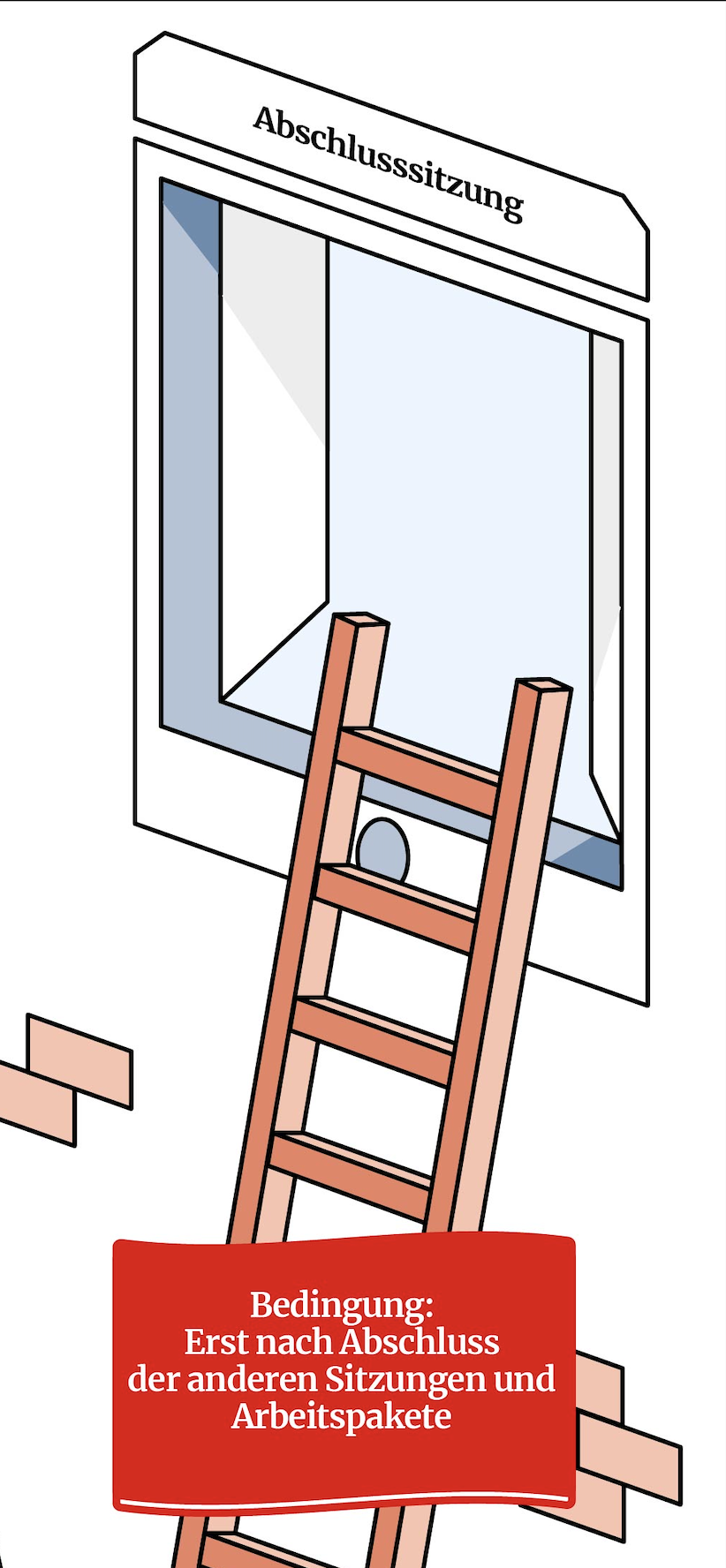 Beachte, dass die vorbereitenden Arbeitspakete (in der Grafik durch die Leiter symbolisiert) zu den einzelnen Sitzungen jeweils etwas Zeit in Anspruch nehmen, was du bei deiner Terminplanung berücksichtigen solltest.